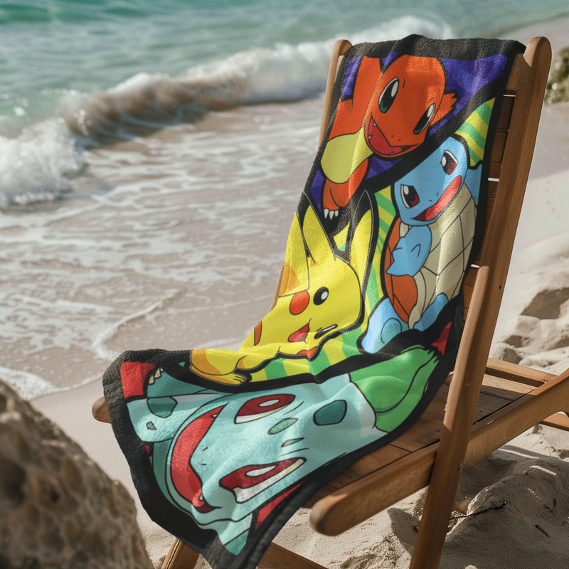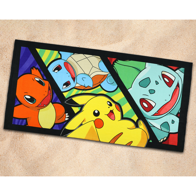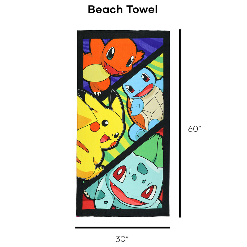 Bring a Pokémon adventure to the beach or pool with this colorful towel featuring four beloved Pokémon in a layered stripe design. At the top, Charmander stands with his arms wide, flashing a cheerful smile against a purple stripe background. Below, Squirtle and Pikachu add playful energy—Pikachu faces away but turns his head with a grin, while Squirtle reaches forward in surprise against a green stripe background. At the bottom, Bulbasaur completes the lineup, smiling against a red stripe background. Soft, lightweight, and absorbent, this vibrant towel is ideal for Pokémon fans